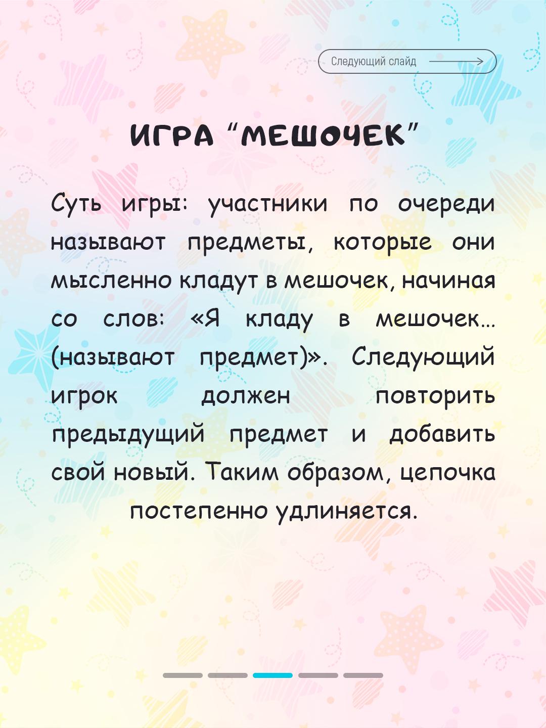 Следующий игрок повторяет список и добавляет свой предмет: «Я кладу туда шляпу и мяч!»