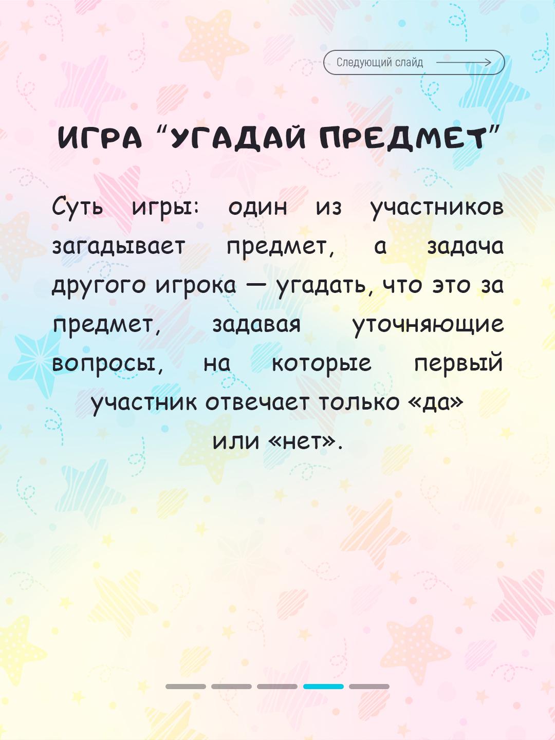 Игра развивает ассоциативное мышление, внимание и способность к логическому анализу. Один из игроков описывает предмет, не называя его, а остальные должны угадать, о чём идёт речь.